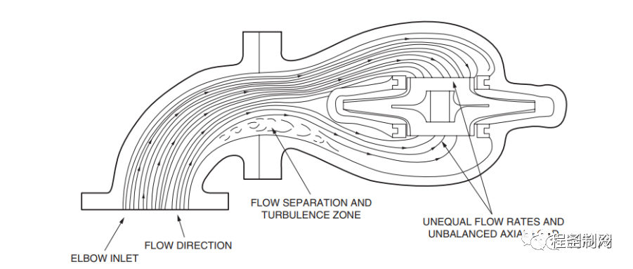 上圖顯示了直接安裝在雙吸泵吸入口上的小口徑彎頭的流動分離和湍流區(qū)。如果需要在吸入口的上游安裝彎頭,請考慮將其轉(zhuǎn)換為大口徑彎頭或?qū)Я餮b置,以平滑過渡到泵中。只要導(dǎo)流裝置的壓降不超過必要的NPSH余量,就可以很好地工作。