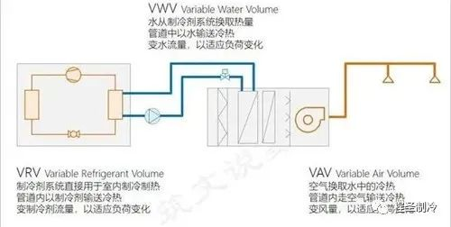 VRV全稱變制冷劑流量系統(tǒng),VWV全稱變水量系統(tǒng),VAV全稱變風(fēng)量系統(tǒng)。它們都是空調(diào)系統(tǒng)的一種形式,將它們按空調(diào)過(guò)程串起來(lái),就容易理解了。