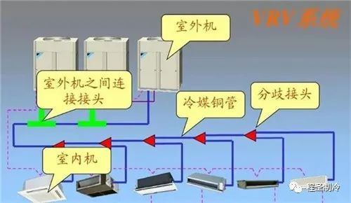 VRV從形式上可以理解為分體式空調(diào)的“一拖多”,由一臺(tái)或多臺(tái)室外機(jī)帶動(dòng)多個(gè)室內(nèi)機(jī)末端,直接由制冷劑系統(tǒng)對(duì)室內(nèi)制冷制熱。為了適應(yīng)室內(nèi)負(fù)荷的變化,需要不斷調(diào)整管內(nèi)制冷劑的流量,就稱為VRV變制冷劑流量空調(diào)。