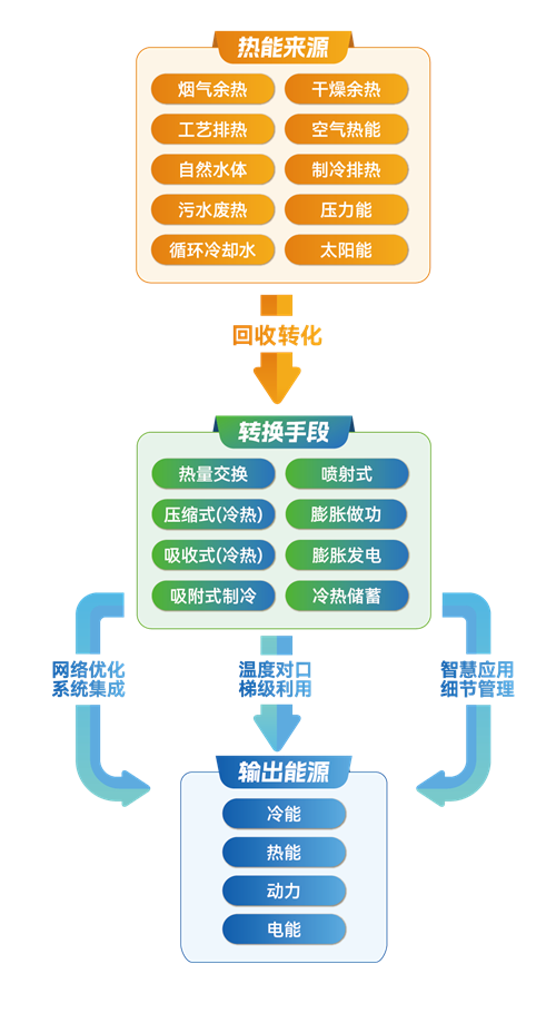 在國內外碳達峰和碳中和政策的全面推進的進程中,冰輪環境針對工業領域中的用熱調度及余熱回收開展研究,為用戶提供特定場景下能源綜合利用系統解決方案。冰輪的余熱回收范圍覆蓋0-600℃,可提供工業生產范圍內各溫度區間的冷、熱需求,能源形式涵蓋冷水、熱水、蒸汽、電力等。可實現由熱制冷、由熱產汽、由熱發電等一系列能量轉移及轉化,實現工業熱能的高效利用,減少能耗及環境污染,助力雙碳目標推進實施。主要產品涵蓋機械式熱泵機組、水蒸氣增壓機組、吸收式冷水熱泵機組、余熱余壓膨脹發電機組等
