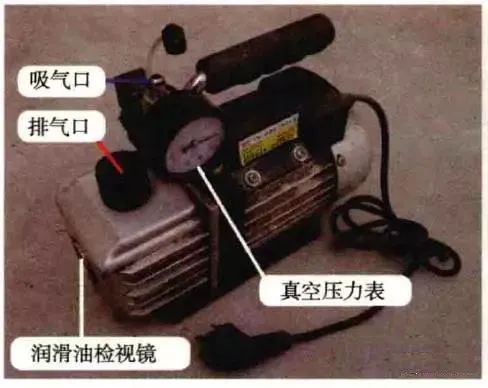 真空泵是排除系統空氣的專用工具,實物外形見下圖,可將空調器制冷系統內真空度達到 -0.1 MPa 。