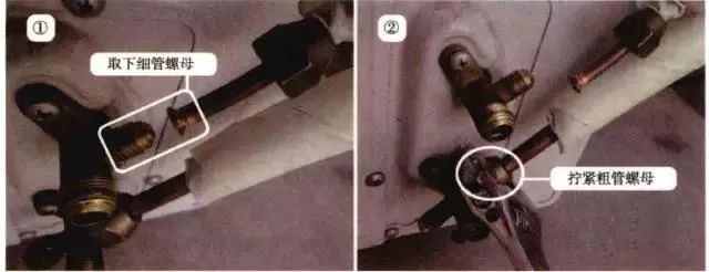 7)、注意在擰緊細管螺母過程中, 應將壓力表開關打開一些, 使用二通閥處和細管喇叭口處均向外排氣時再擰緊。