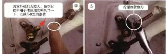 5)、室內機和連接管道的空氣排除較快, 而室外機有毛細管和壓縮機的雙重阻礙作用, 所以室外機的頂空時間應長于室內機, 用手堵住連接管道中細管的喇叭口, 此時只有室外機二通閥處向外排空, 這樣可以減少氟R22的浪費。