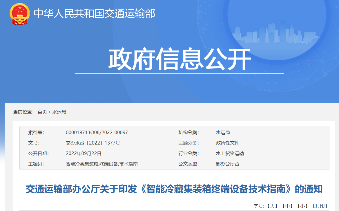為深入貫徹《國(guó)務(wù)院辦公廳關(guān)于印發(fā)“十四五”冷鏈物流發(fā)展規(guī)劃的通知》精神,認(rèn)真落實(shí)《交通運(yùn)輸部 國(guó)家鐵路局 中國(guó)民用航空局 國(guó)家郵政局 中國(guó)國(guó)家鐵路集團(tuán)有限公司關(guān)于加快推進(jìn)冷鏈物流運(yùn)輸高質(zhì)量發(fā)展的實(shí)施意見》《交通運(yùn)輸部辦公廳關(guān)于開展冷藏集裝箱港航服務(wù)提升行動(dòng)的通知》等要求,交通運(yùn)輸部組織編制并發(fā)布了《智能冷藏集裝箱終端設(shè)備技術(shù)指南》(以下簡(jiǎn)稱《指南》),進(jìn)一步規(guī)范智能冷藏集裝箱終端設(shè)備技術(shù)要求,提高冷藏集裝箱港航服務(wù)品質(zhì),推進(jìn)冷鏈物流高質(zhì)量發(fā)展。
